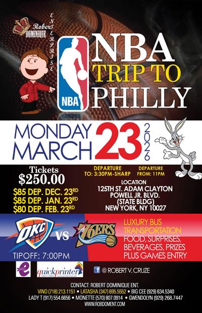 Join Robert Dominique Enterprise for an exciting NBA Trip to Philly on Monday, March 23, 2026, to see the Oklahoma City Thunder vs. the Philadelphia 76ers.